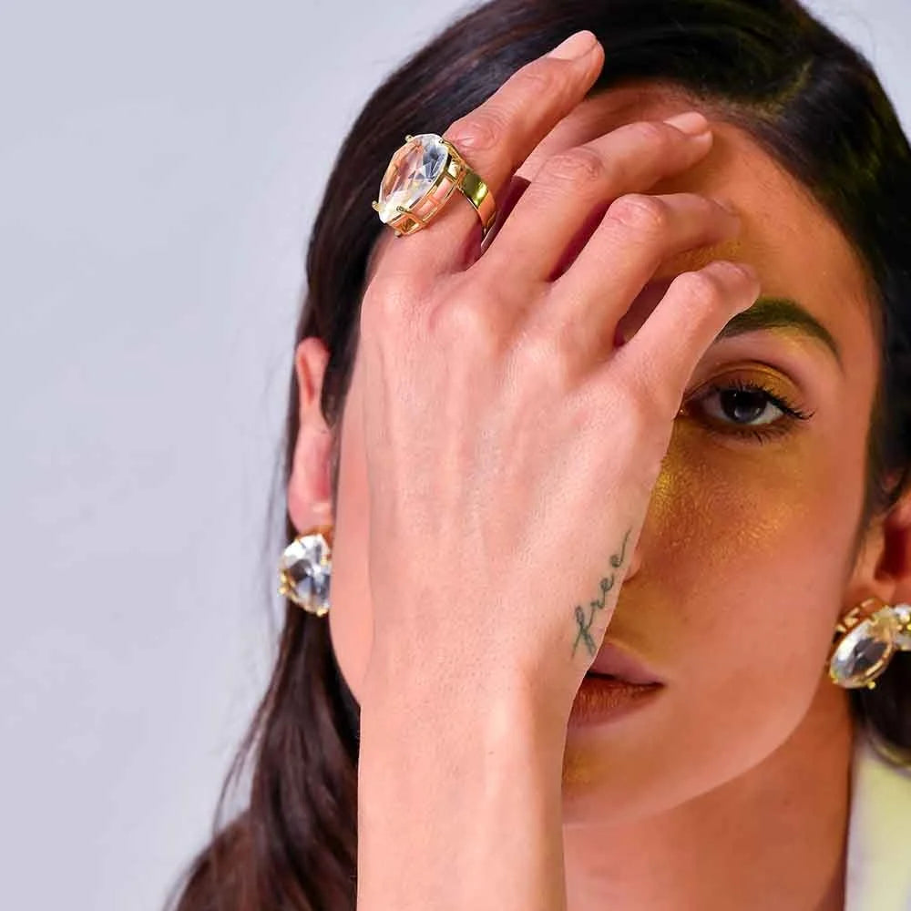 A transparência, a beleza e atemporalidade dos cristais em sua versão maximalista com o nosso novo banho ouro vintage, nos conecta ao conceito da alma, do eu no seu mais profunda essência.