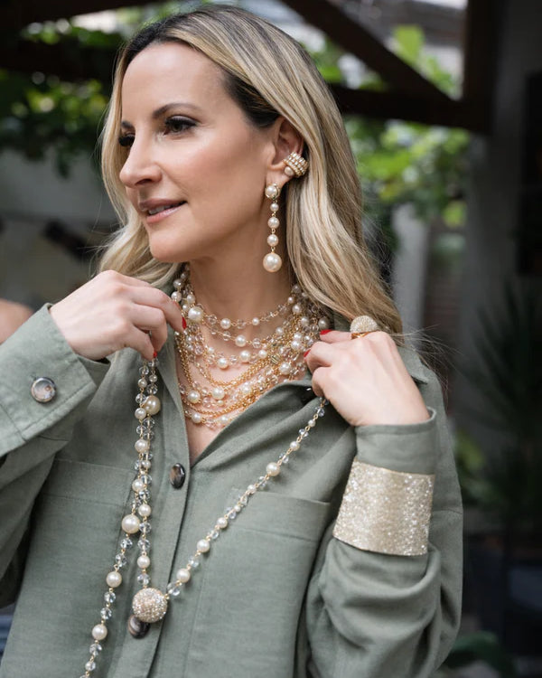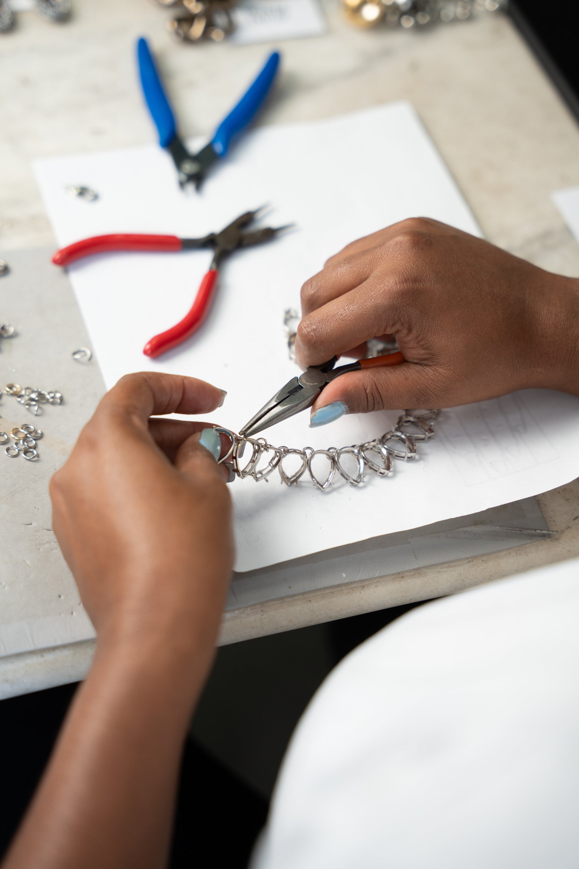 Com 84 cm de comprimento e 57 g de peso, a peça possui banho prateado (niquel free) e acabamento artesanal, com cada esfera engatada manualmente. Por se tratar de um acessório feito à mão, pequenas variações de cor ou tamanho podem ocorrer, tornando cada body chain única.