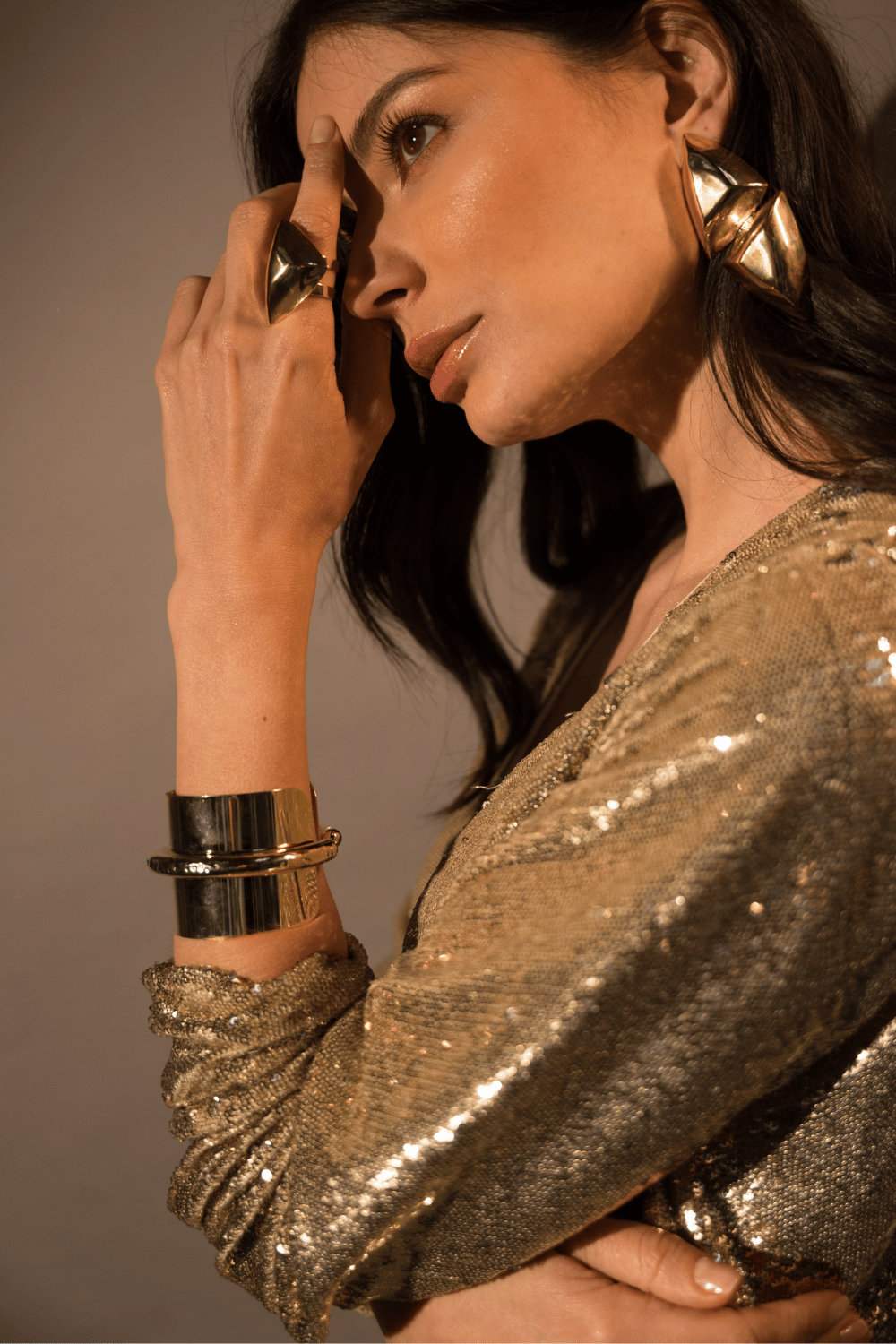 Handmade Exclusive, o bracelete traz um desenho marcante com acabamento dourado espelhado que reflete luz e atitude. Impactante, sofisticado e marcante — uma peça statement criada para ocupar espaço e transformar o look.