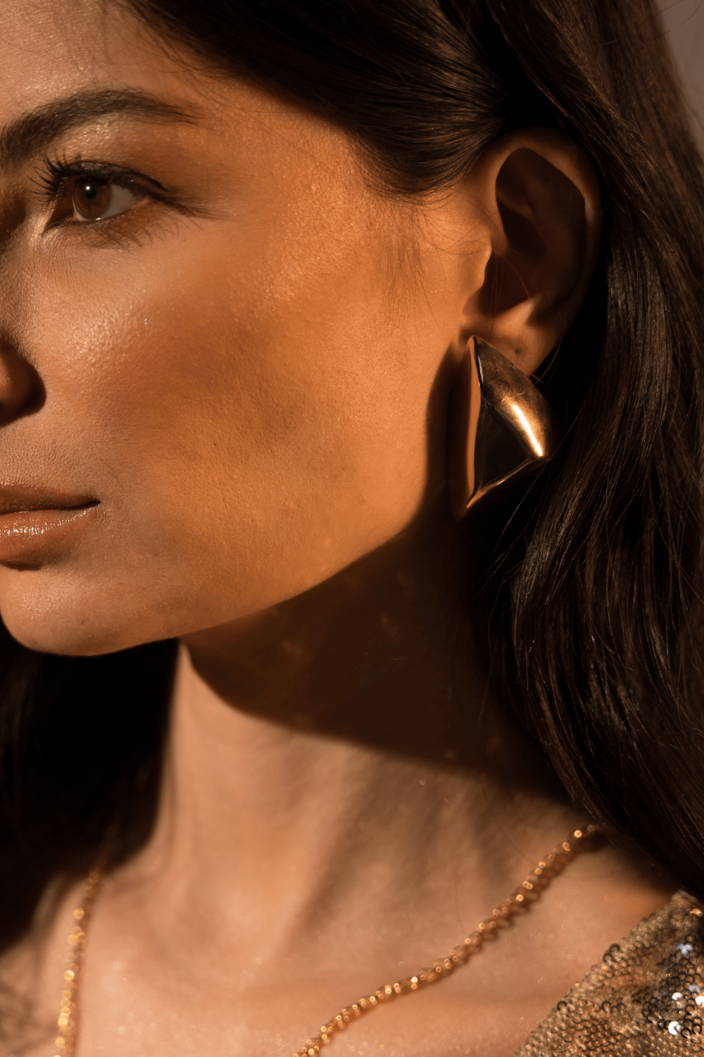 O triângulo bold em acabamento dourado espelhado cria um visual marcante e atual. Um brinco statement, elegante e moderno — perfeito para transformar o look com atitude.
