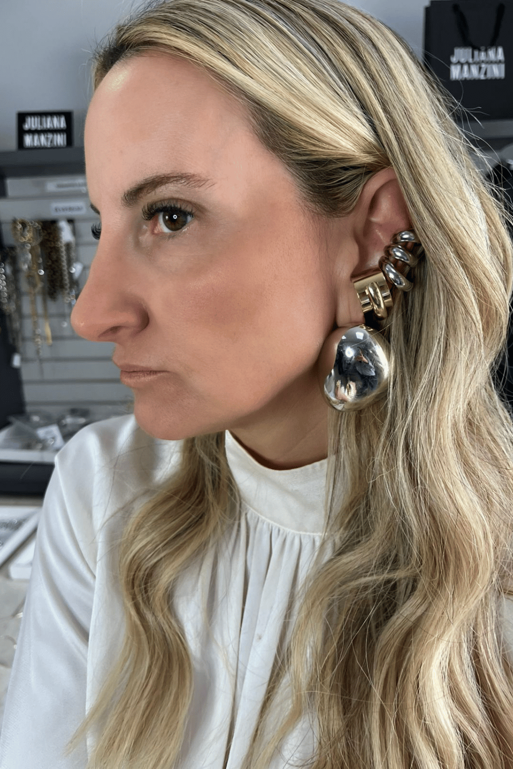 Criado por eletroformação, o brinco traz volume bold com leveza surpreendente e acabamento prateado espelhado que reflete a luz com intensidade. Um statement moderno, forte e impossível de passar despercebido.