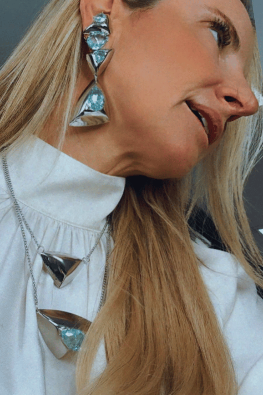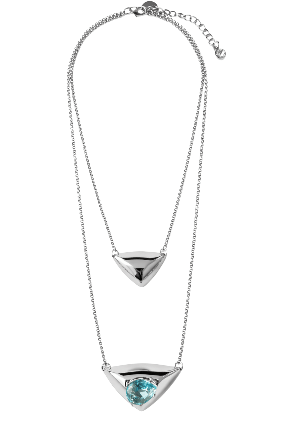 O colar duplo combina um triângulo bold de superfície lisa com outro cravejado em pedra azul, criando contraste entre metal puro e brilho preciso. Uma composição feita para estruturar o look com personalidade e sofisticação.