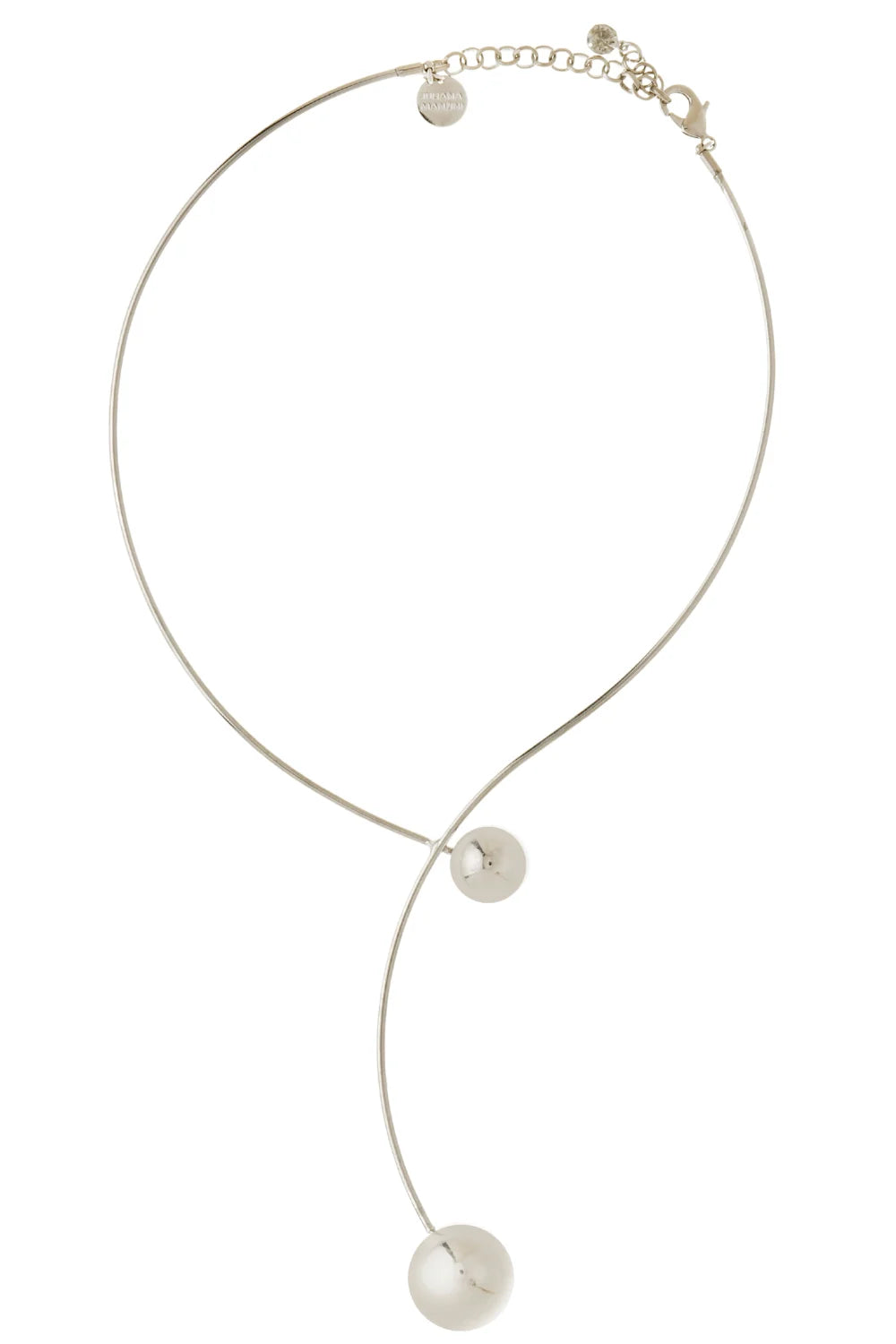 O colar traz volumes metálicos polidos que criam um jogo de equilíbrio e fluidez sobre o corpo. O acabamento prateado espelhado reflete a luz com intensidade, entregando uma presença forte, moderna e sofisticada. Um statement minimal e poderoso — feito para dominar o look com naturalidade.
