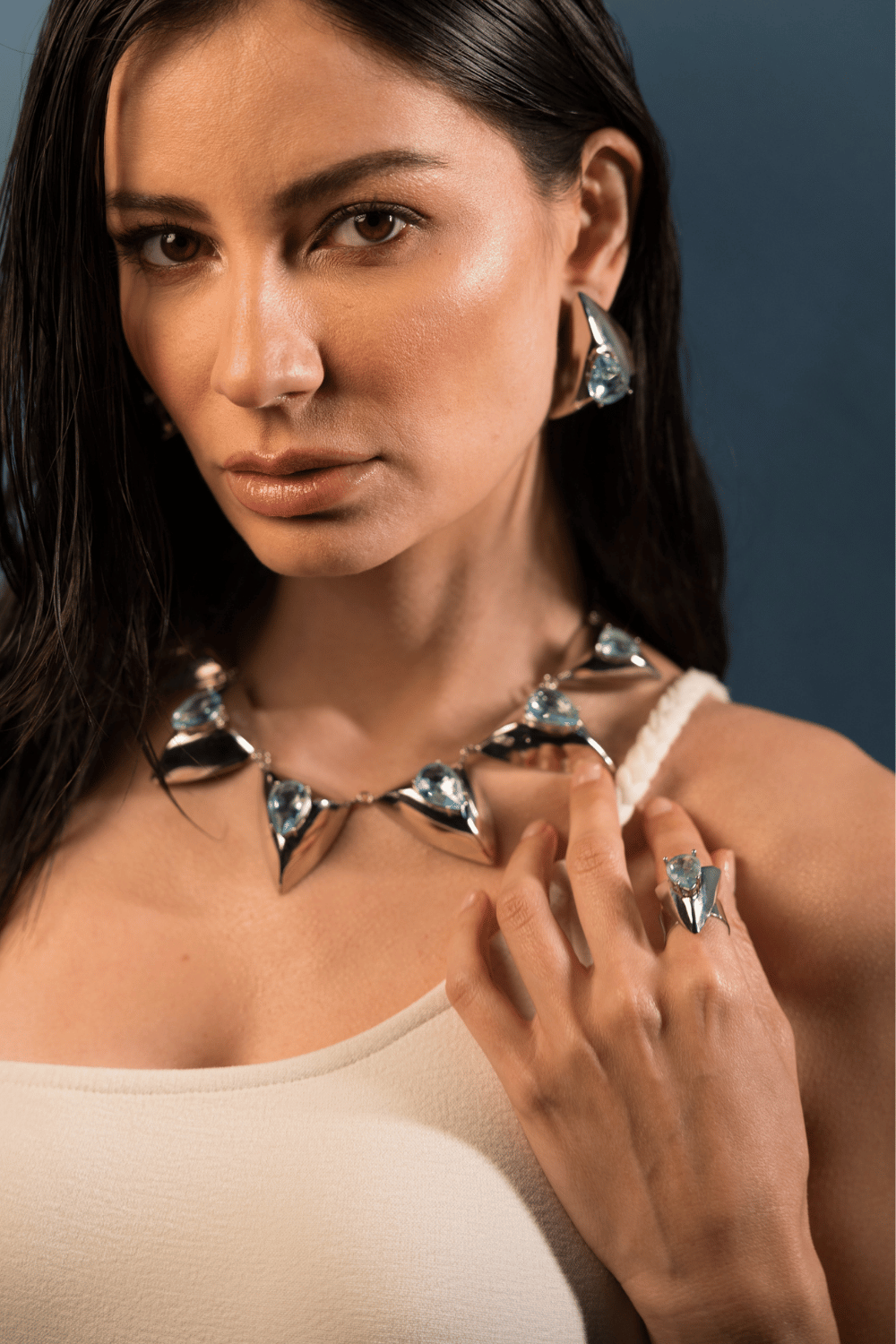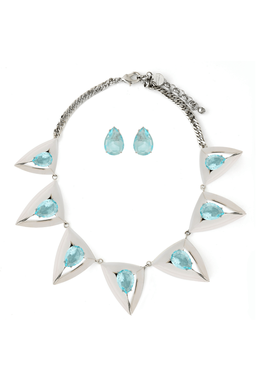 O colar com sete triângulos bold em acabamento espelhado ganha pedras light blue cravejadas manualmente, criando um contraste sofisticado, preciso e extremamente fashion. O brinco de gota azul completa a composição com equilíbrio e intenção. Um kit statement, impactante e memorável.