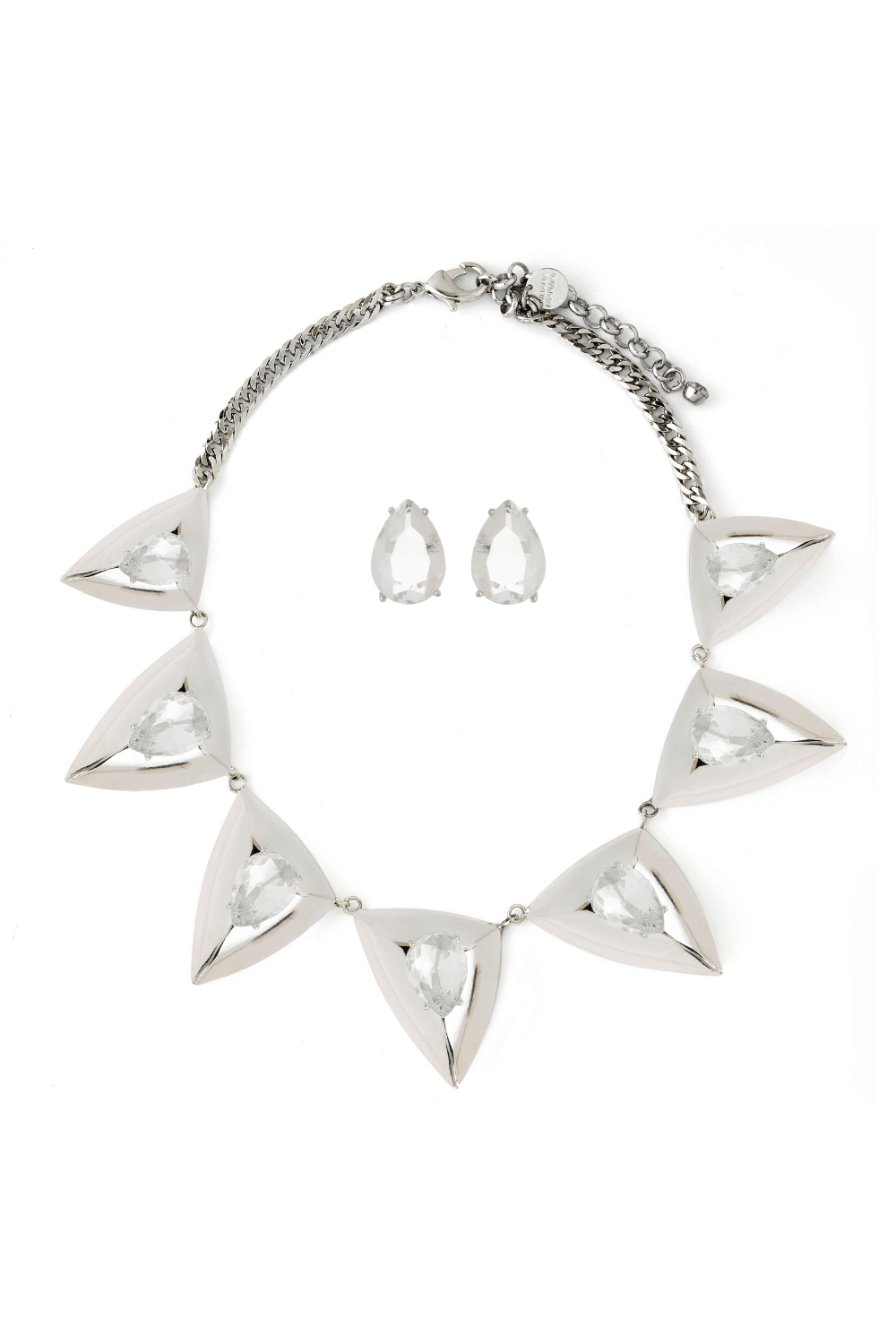 O colar com sete triângulos bold recebe pedras centrais cravejadas manualmente, criando um visual sofisticado e contemporâneo. O brinco em gota de cristal completa o conjunto com leveza e elegância. Um kit marcante, atual e pensado para composições que se destacam sem excessos.