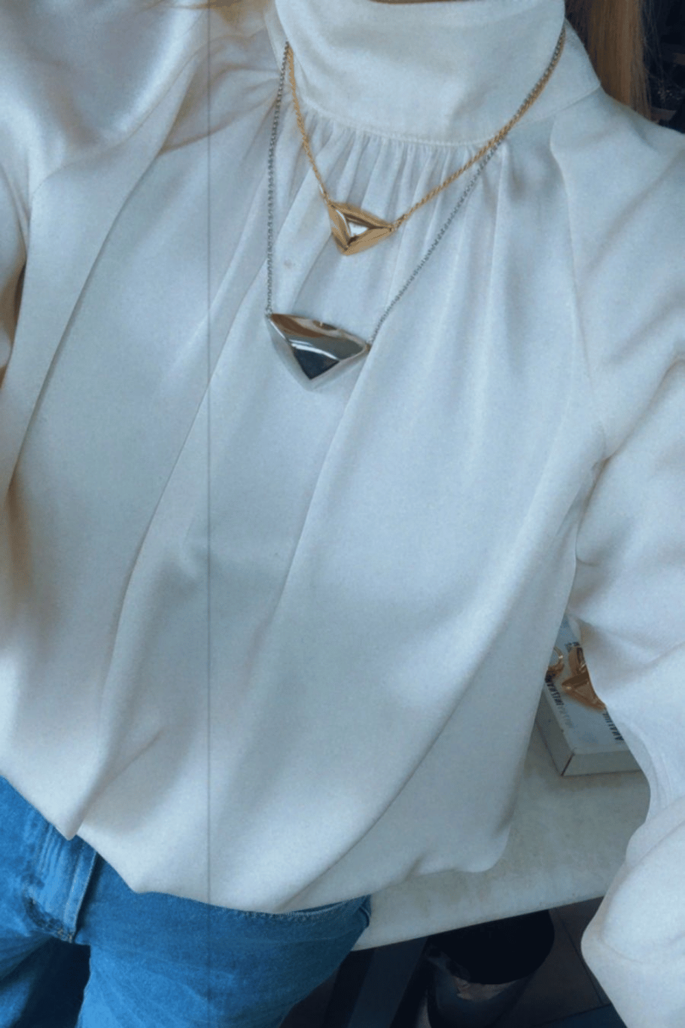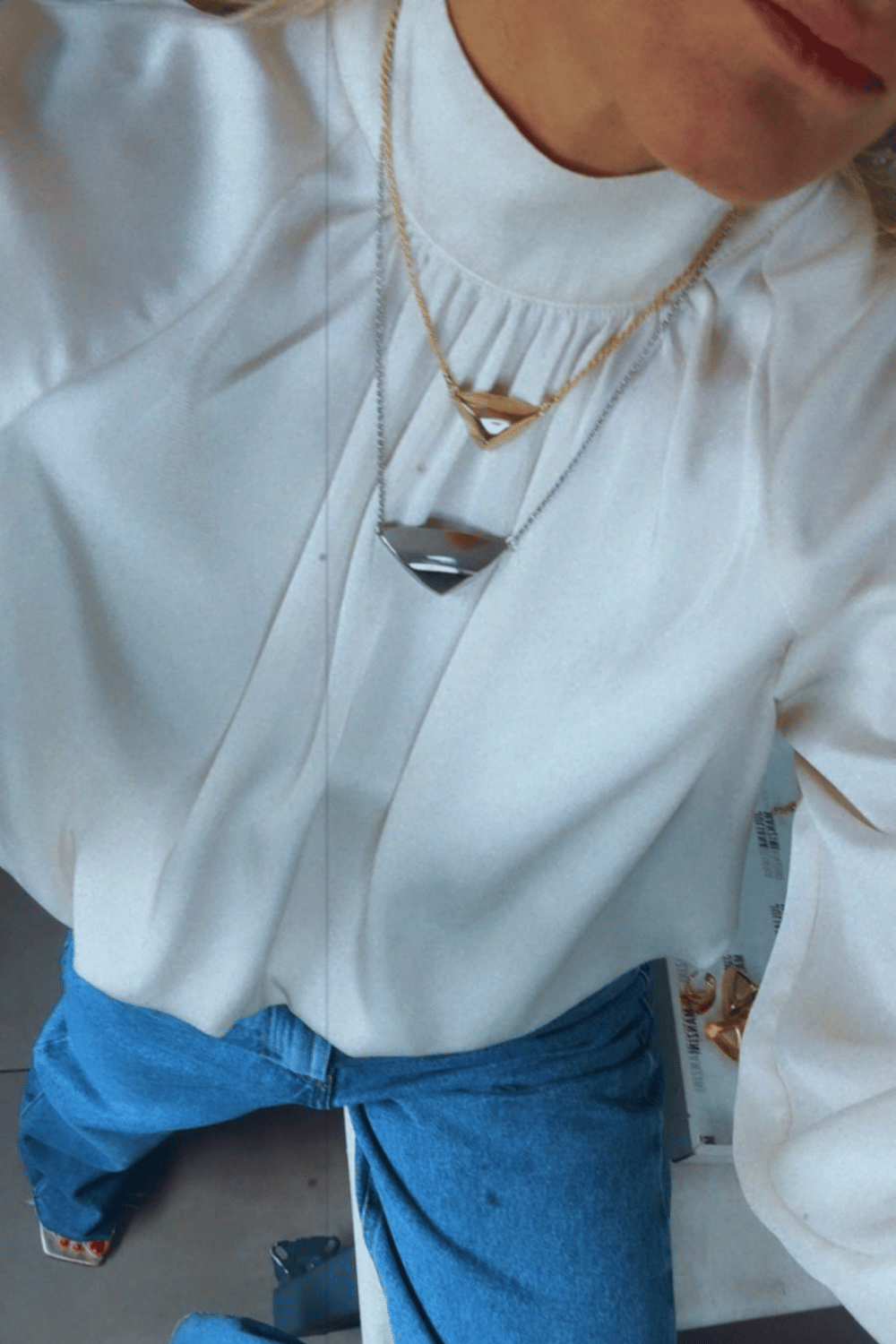 A dupla de colares traz o mix de banhos dourado e prateado em formas geométricas marcantes, criando um jogo de brilho moderno e cheio de atitude. Versátil, atual e poderoso — use junto para impacto máximo ou separado para composições mais sutis. Um essencial para quem domina o styling.